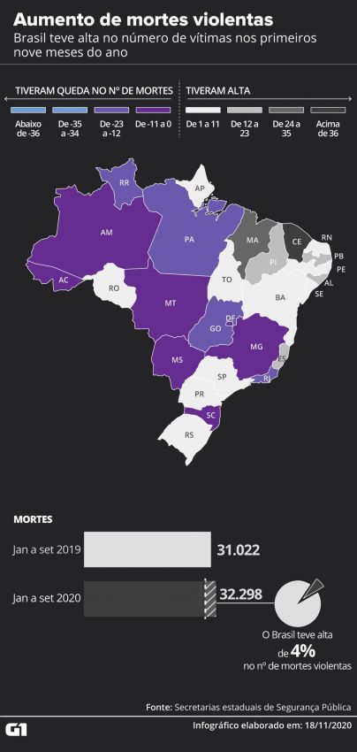 Essa é a segunda maior variação dentre todos os estados do país, atrás apenas do Ceará. O aumento de mortes acontece mesmo durante a pandemia do novo coronavírus, que fez com que estados adotassem diversas medidas de isolamento social durante o ano. Ou seja, houve alta na violência mesmo com menos pessoas nas ruas.
