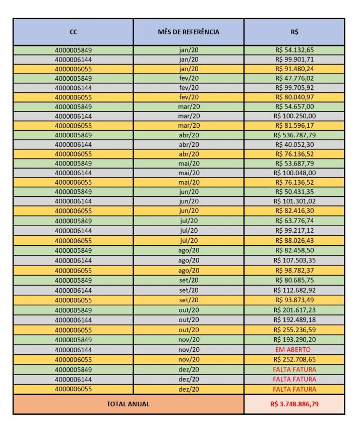 O Serviço Autônomo de Água e Esgoto (SAAE) de Açailândia divulgou oficialmente, nesta terça-feira (29/12). Um demonstrativo de pagamento com TOTAL ANUAL no valor R$ 3.748.886,79 (contas de janeiro/2020 até dezembro/2020) com todos os valores mensais que são pagos para a operadora de energia, sendo que a única conta em aberto é a do mês de Novembro/2020, e de acordo informações repassadas pelo Diretor Sr. Messias será paga nesta quarta-feira (30/12).