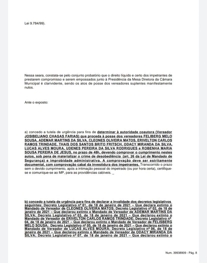 Com a decisão, o Juiz Dr. José Pereira Lima Filho dá o prazo de 48 horas para que o atual presidente da câmara municipal Josibeliano chagas Farias (Ceará) possa dá posse aos 09 vereadores que tiveram seus mandatos extintos.