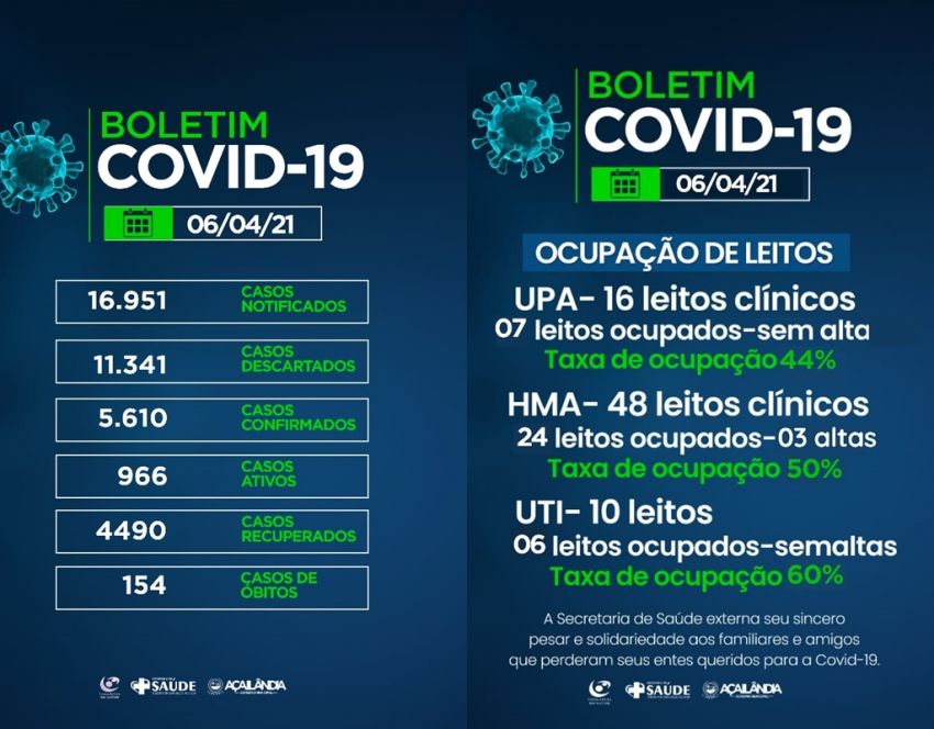 Dos 5.610 casos confirmados no município; 4.490 evoluíram para recuperação; 966 encontram-se ativos; temos 154 óbitos.