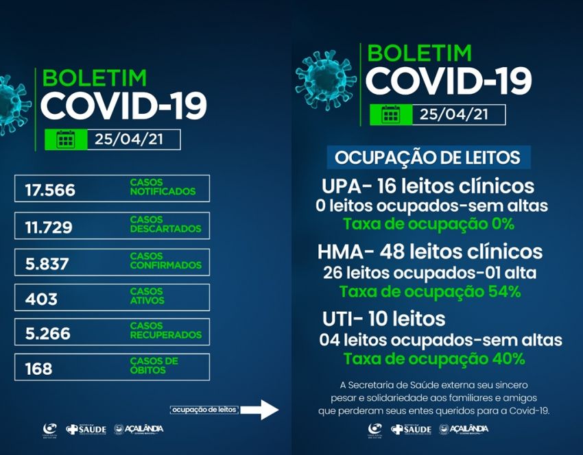 Acompanhe o boletim epidemiológico da Covid-19 em Açailândia – 25 de abril de 2021