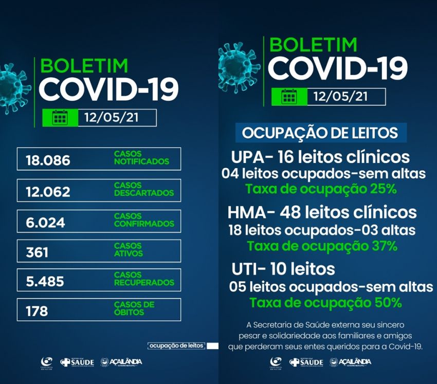Acompanhe o boletim epidemiológico da Covid-19 em Açailândia – 12 de maio de 2021