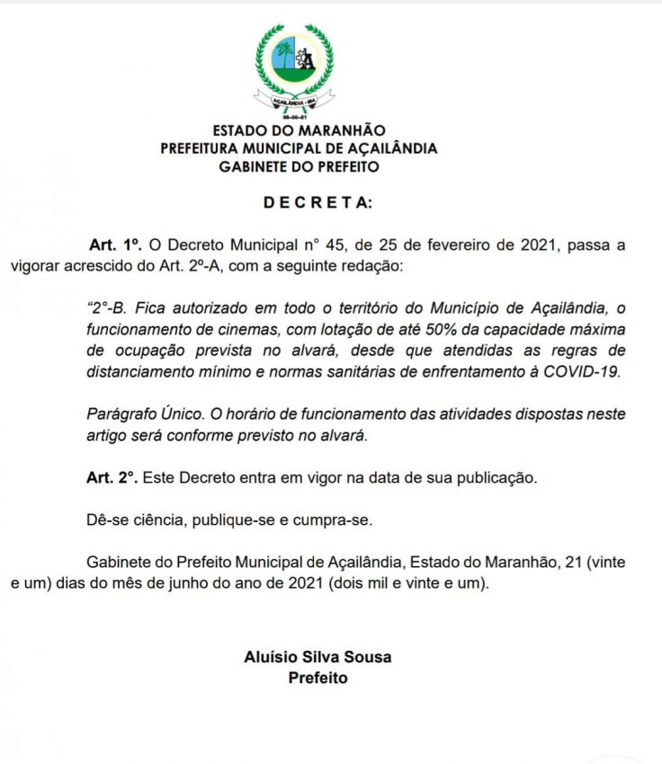 AÇAILÂNDIA – Cinema deve volta a funcionar com capacidade de 50% diz decreto; veja