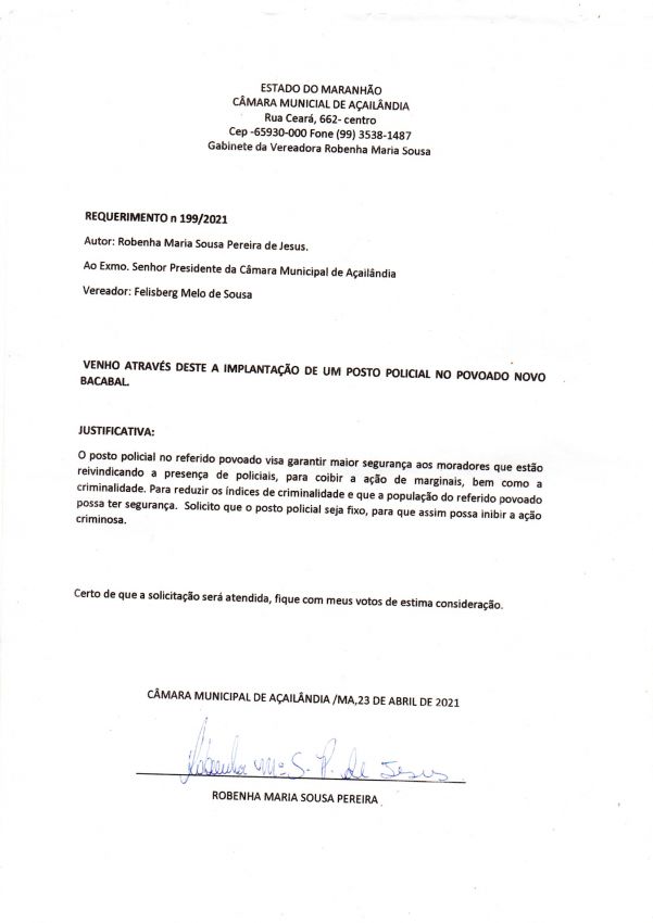 Uma outra reivindicação importante feita pela vereadora através do requerimento de nº199/2021, é a implantação de um posto policial na comunidade de Novo Bacabal.