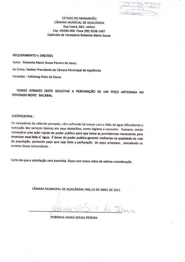 Através do requerimento de nº198/2021, a Vereadora solicitou a perfuração de um poço artesiano para atender a comunidade do povoado novo Bacabal.