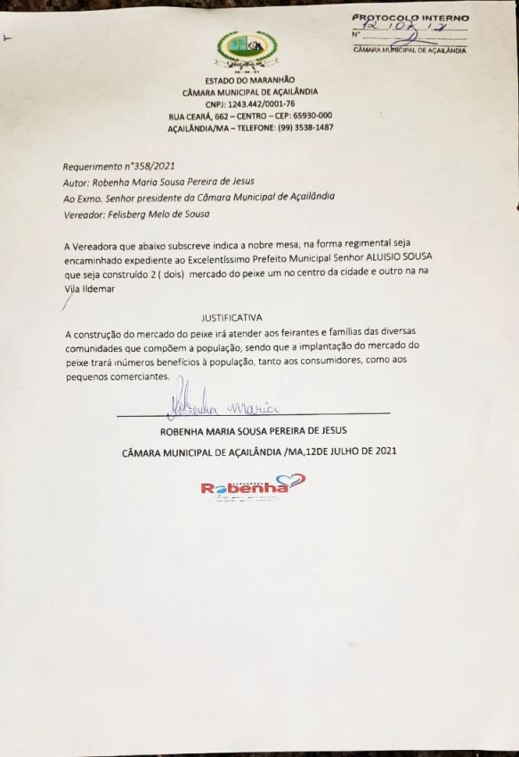 Através de requerimento de nº 358/21, à vereadora Robenha, solicitou junto ao poder executivo, a construção de dois Mercados do Peixe: Um para o centro da cidade e outro na vila Ildemar o maior bairro do município.