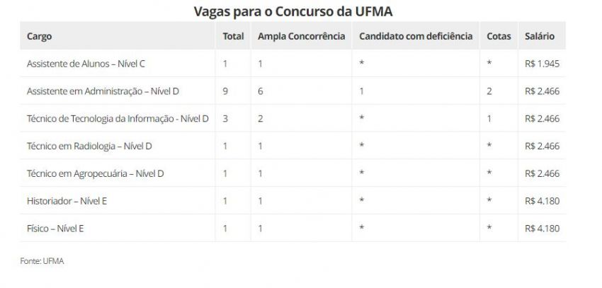 A Universidade Federal do Maranhão (UFMA) divulgou edital de concurso público com 17 vagas para cargos efetivos na instituição, nos Campus São Luís, Imperatriz, Chapadinha, Codó, Bacabal, Pinheiro, Grajaú, São Bernardo e Balsas.