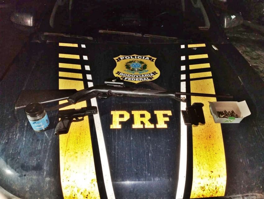 Ao lado do condutor foi avistado uma carabina cal. .22, marca CBC/Brasil. Ao ser questionado, o passageiro informou que não possuía porte de arma e que a carabina pertence a seu pai. Ao realizar busca no veículo foram encontrados ainda uma pistola cal. 9mm, marca Forjas Taurus; 33 munições cal. 9mm, marca CBC/Brasil; 91 unidades de munição cal. .22, marca Companhia Brasileira de Cartuchos (CBC)/Brasil.