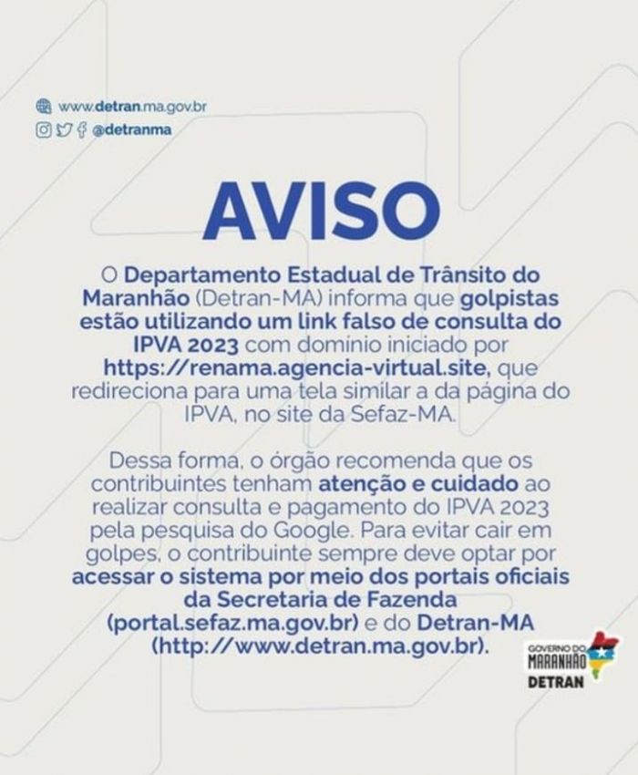 Para evitar cair em golpes o contribuinte sempre deve optar por acessar o sistema por meio dos portais oficiais da Secretaria de Fazenda (portal.sefaz.ma.gov.br) e do DETRAN/MA (http://www.detran.ma.gov.br/).
