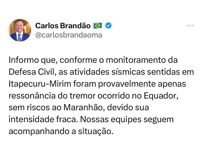 O governador do Maranhão, Carlos Brandão (PSB), informou que a atividade sísmica foi, provavelmente, uma ressonância do tremor de terra ocorrido no Equador. O tremor de magnitude 6,8, foi registrado no sábado e deixou, ao menos 13 pessoas mortas e 120 feridas.