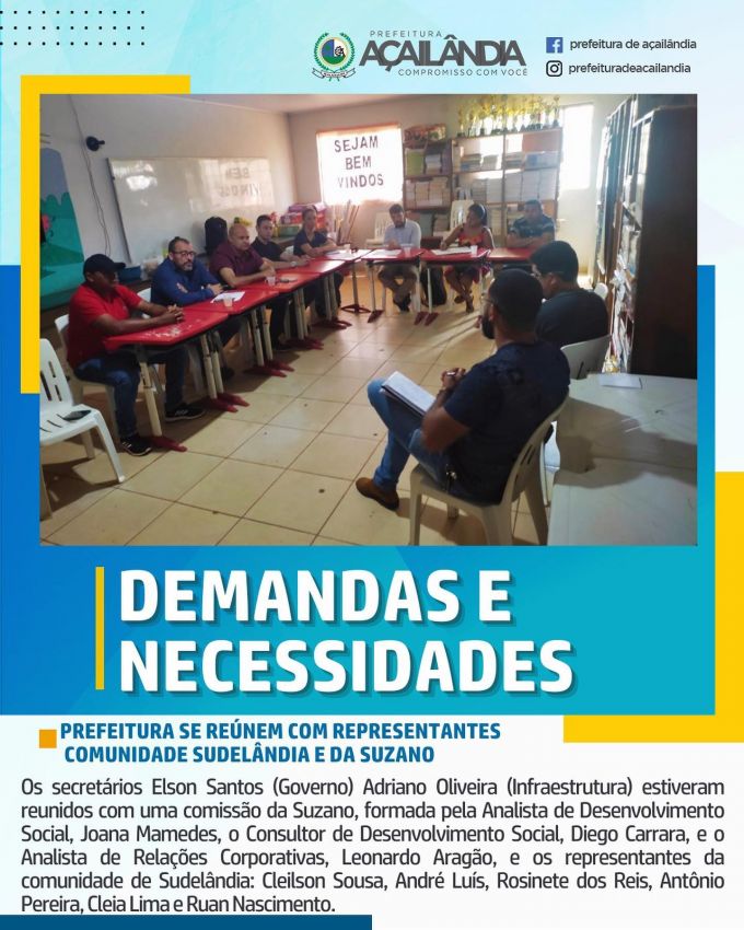 Os secretários Elson Santos (Governo) Adriano Oliveira (Infraestrutura) estiveram reunidos com uma comissão da Suzano, formada pelos representantes: a Analista de Desenvolvimento Social, Joana Mamedes, o Consultor de Desenvolvimento Social, Diego Carrara, e o Analista de Relações Corporativas, Leonardo Aragão, e os representantes da comunidade de Sudelândia: Cleilson Sousa, André Luís, Rosinete dos Reis, Antônio Pereira, Cleia Lima e Ruan Nascimento.