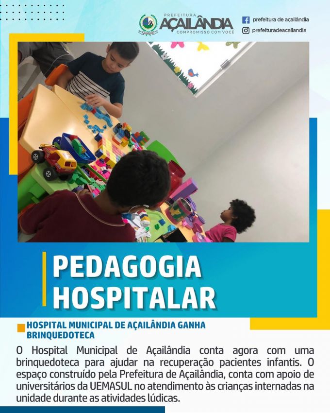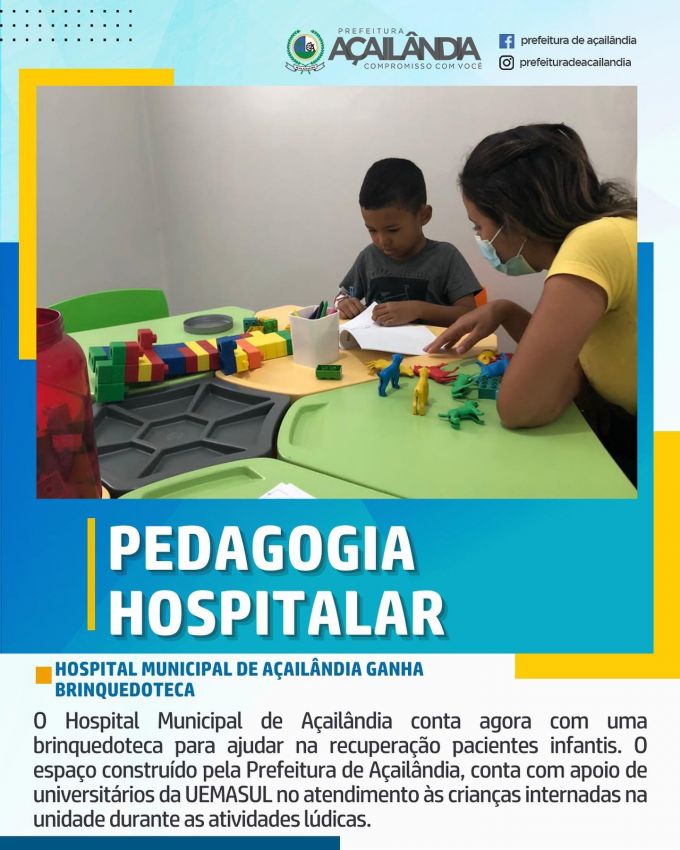 O Hospital Municipal de Açailândia conta agora com uma brinquedoteca para ajudar na recuperação pacientes infantis. O espaço construído pela Prefeitura de Açailândia, conta com apoio de universitários da UEMASUL no atendimento às crianças internadas na unidade durante as atividades lúdicas.