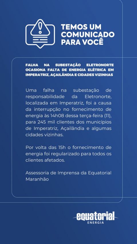 De acordo com a Equatorial, cerca de 245 mil clientes dos municípios de Imperatriz, Açailândia e algumas cidades vizinhas, foram atingidos pela interrupção.