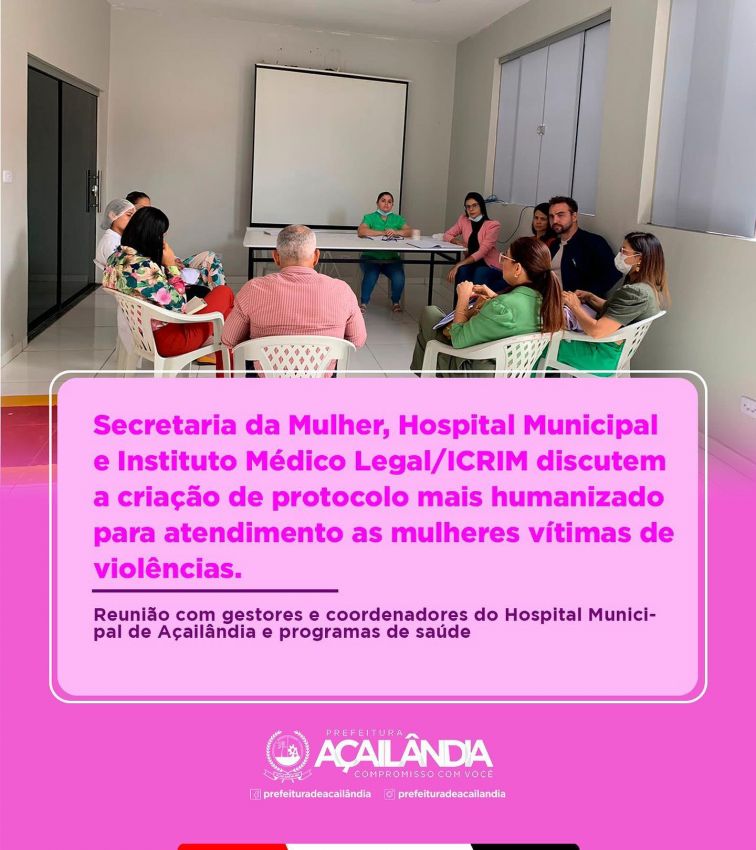 A equipe da Secretaria Municipal da Mulher(SMM) representada pela secretária, Valéria Aquino e Maria Lúcia, estiveram em reunião com toda a Rede de Atenção à Mulher do Hospital Municipal de Açailândia, Dr. Marcos, diretor do Instituto Médico Legal o médico legista e diretor do HMA Dr. Rodrigo, participaram da discussão acerca da criação de um protocolo mais humanizado para atendimento a mulheres agredidas.