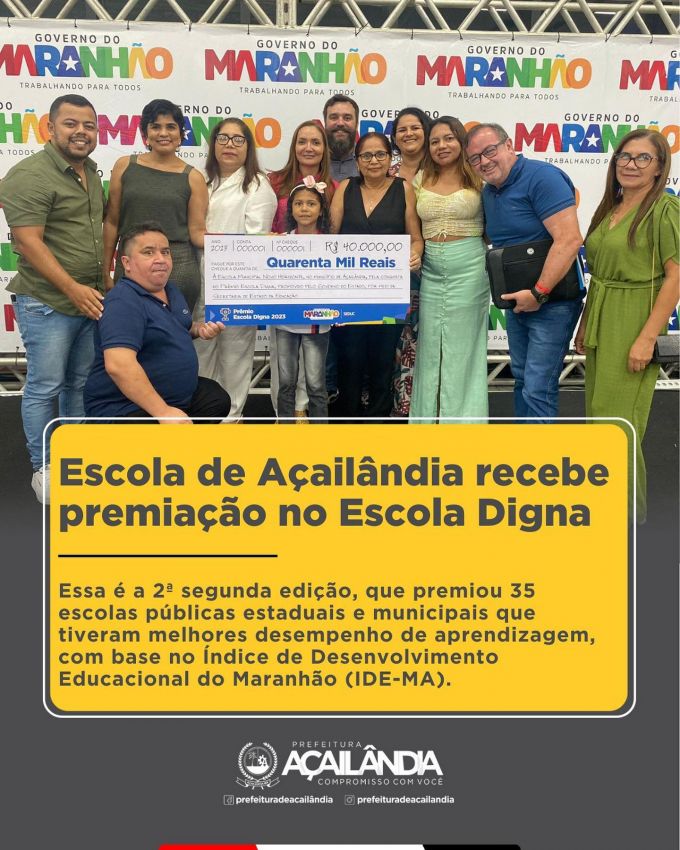 Durante a cerimônia, o prefeito de Açailândia, Aluísio Sousa, foi contemplado com o prêmio ‘Prefeito (a) da Educação’, categoria Selo Bronze. Por meio do selo, a SEDUC busca estimular o desenvolvimento da excelência, equidade e da qualidade social dos sistemas públicos no Maranhão, valorizar a gestão educacional com foco na melhoria da aprendizagem dos estudantes e incentivar que cada município faça cada vez mais investimentos para melhorar a rede municipal de ensino.