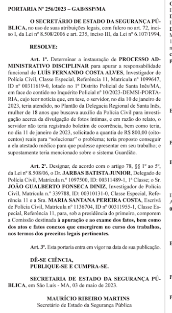 A Secretaria de Segurança Pública do Maranhão (SSP-MA) abriu um processo administrativo para investigar a conduta do investigador da Polícia Civil do Maranhão (PC-MA), Luís Fernando Costa Alves, acusado de ter cobrado R$ 800 para investigar um caso de vazamento de fotos íntimas de uma jovem, de 18 anos.