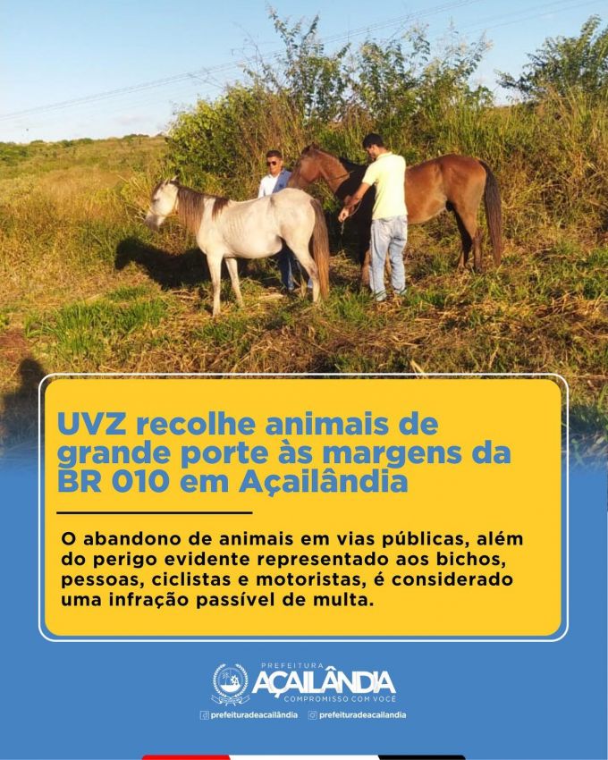 No último sábado, (24/06), a Unidade de Vigilância em Zoonoses, órgão vinculado à secretaria municipal de Saúde, apreendeu dois cavalos que circulavam às margens da BR 010, em Açailândia.