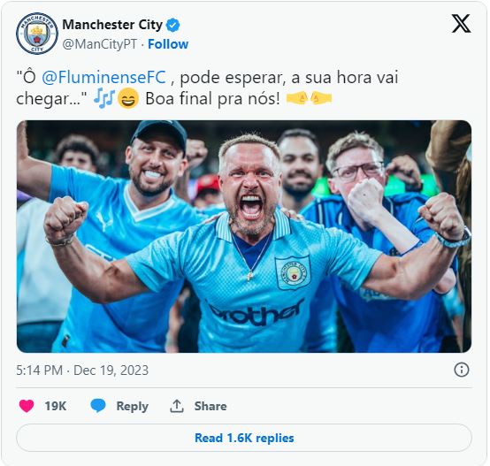 Após se garantir na final do Mundial de Clubes contra o Fluminense, o Manchester City usou o bom humor nas redes sociais. Em sua conta do Instagram e o perfil em português no Twitter, o clube provocou o adversário desta sexta-feira, com leve referência ao rival do time brasileiro, Flamengo.
