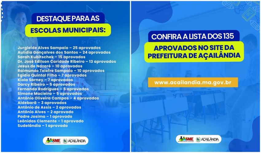 A Prefeitura de Açailândia e secretaria de Educação parabenizam a todos os 135 estudantes da rede municipal de ensino que foram aprovados no IFMA - Instituto Federal do Maranhão campus Açailândia. Muito sucesso a todos!