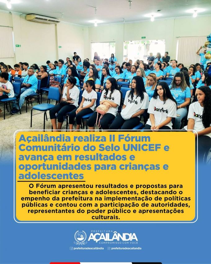 A Prefeitura de Açailândia, em parceria com o Conselho Municipal dos Direitos da Criança e do Adolescente (COMUCAA), realizou o II Fórum Comunitário do Selo UNICEF Edição 2021-2024. O evento, ocorrido no dia 25 de junho, apresentou resultados das atividades realizadas nos últimos três anos, beneficiando crianças e adolescentes, e discutiu novas propostas.