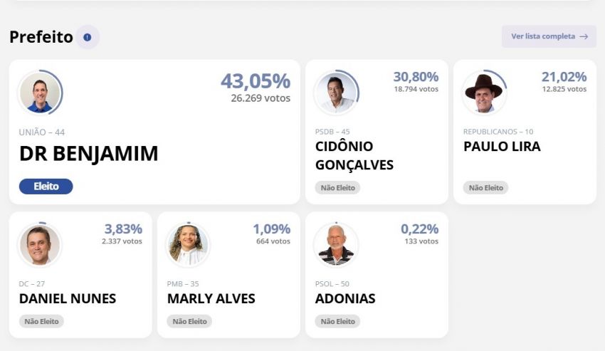 Com 26.269 votos, equivale a 43,05%, Dr. Benjamin (UNIÃO) é eleito, Cidônio Gonçalves (PSDB) fica em segundo lugar com 18.794 votos, equivale a 30,80%, em terceiro lugar vem Paulo Lira (Republicanos) com 12,825 votos, equivale a 21,02%, em quarto lugar Daniel Nunes com 2,337, equivale a 3,83%, Marly Alves em quinto lugar com 664 votos, equivalente a 1,09% e Adonias com 133 votos, equivalente a 0,22%.