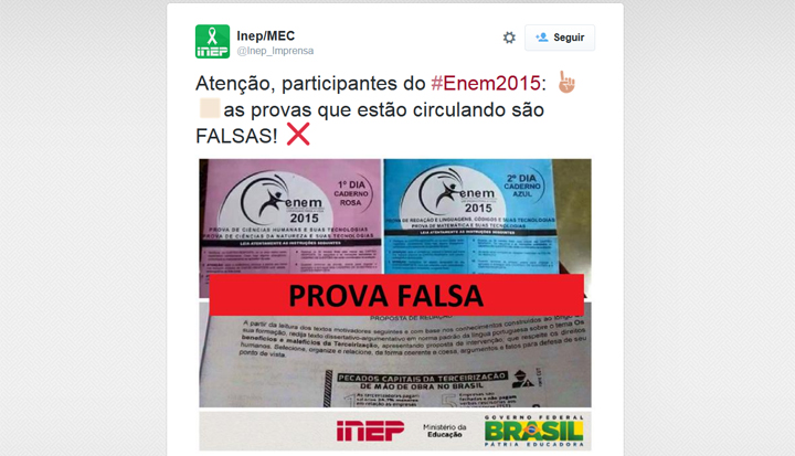No Twitter, o Inep esclareceu: "Atenção, participantes do #Enem2015: as provas que estão circulando são FALSAS! [❌]"