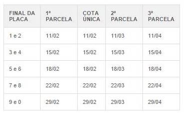 Os contribuintes podem optar por pagar integralmente (cota única) com 10% de desconto até 11 de fevereiro ou parcelar em até três vezes. Para pagar parcelado, o proprietário deve observar o calendário com prazo para quitação de cada parcela (veja na tabela abaixo).