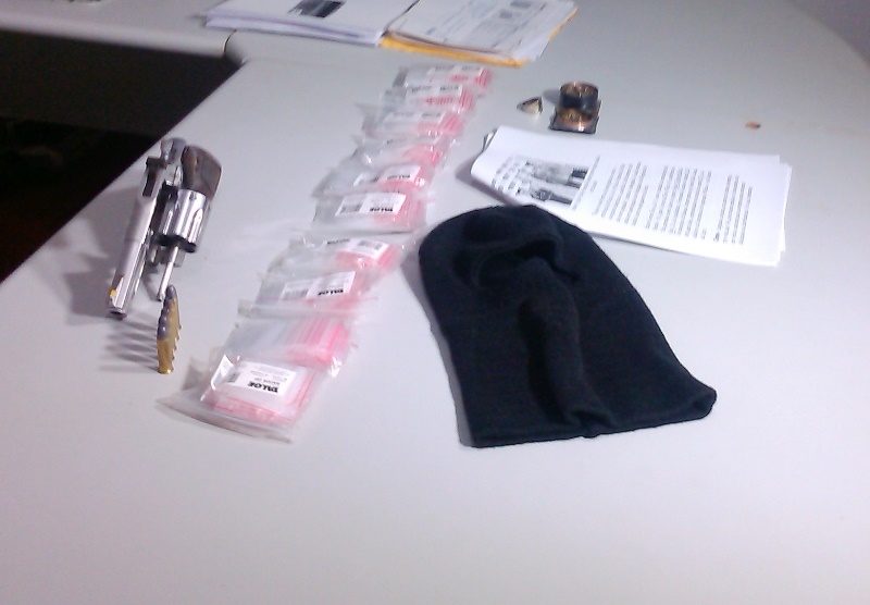 Com Edinan Oliveira Coelho a Polícia encontrou: 01 um revolver calibre 38 municiado, um capuz que era utilizado nos assaltos, invólucros de plástico utilizados para condicionar cocaína para posterior revenda.