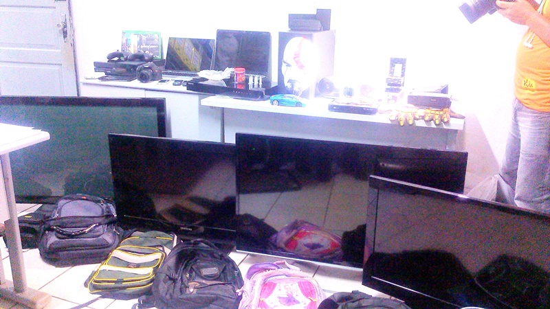 4 TVs led, 1 console (X- Box) 2 notebook,1 câmera fotográfica profissionais, 1 aparelho de som, 7 mochilas dentre outros produtos. Tudo levado o carro da Família.