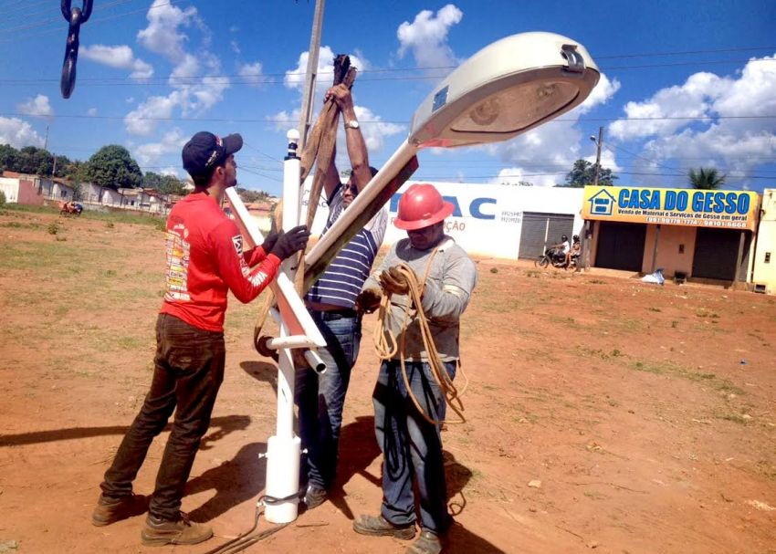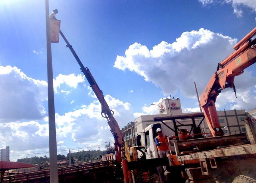 equipe do Departamento de Iluminação do Município realiza os trabalhos para colocação das luminárias nos postes.