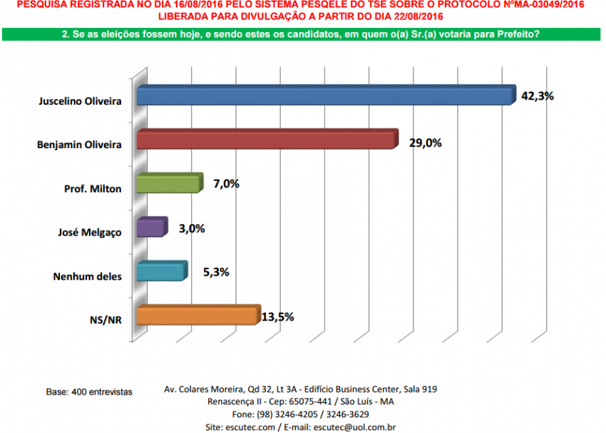 A pesquisa realizada pela ESCUTEC tem margem de erro 4,0% para mais ou para menos e entrevistou 400 pessoas. O prefeito Juscelino Oliveira lidera em todos os cenários, chegando a 42,3%, seguido por Benjamin Oliveira com 29, 0%, Professor Milton 7,0 % e José Melgaço 3, 0%.