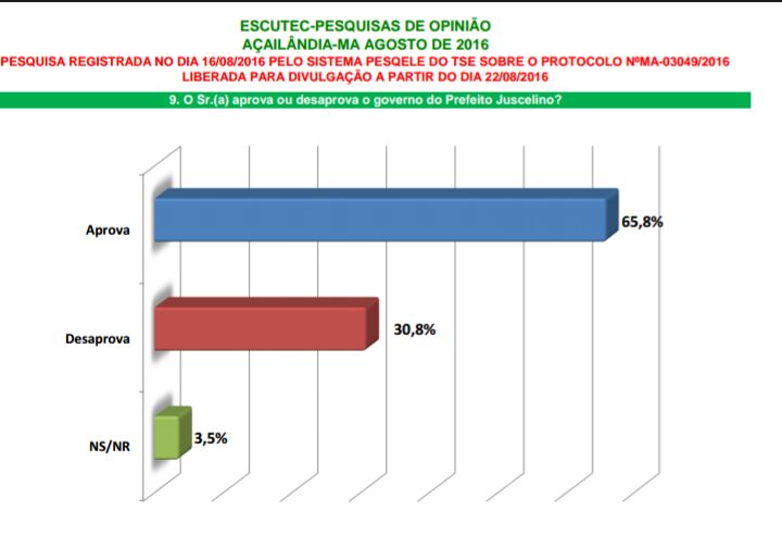 O site Inoticiama.com teve acesso com exclusividade a primeira pesquisa oficial registrada das eleições 2016, em Açailândia. A pesquisa foi realizada no período de 18 a 20 de agosto e está registrada sob protocolo Nº MA - 03049/2016, podendo por tanto ser divulgada oficialmente, conforme a lei eleitoral.