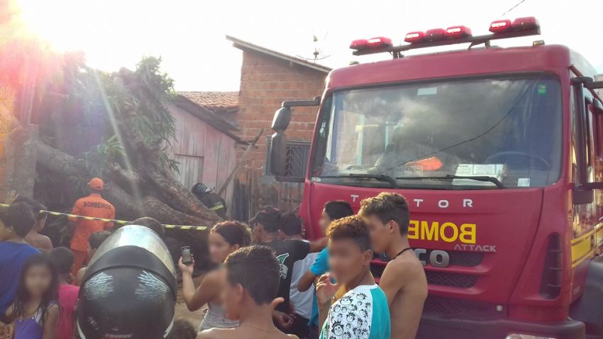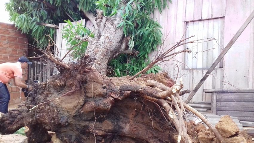 Em outra rua, o pé de mangueira, acabou caindo em cima de uma casa onde estavam três pessoas. Um adolescente acabou se ferindo na cabeça.
