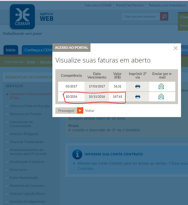 Ainda de acordo com Eliane, ela pretende recorrer na Justiça, caso a Cemar não resolva o problema, já que consta no sistema da Companhia uma conta que ela alega nunca ter recebido e com um valor acima da sua média de pagamento. Além disso, a conta que consta em aberto tem o vencimento no dia 10 de novembro, sendo que a conta que a consumidora pagou venceu no dia 21 de novembro. Por tanto, vieram duas cobranças no mesmo mês.
