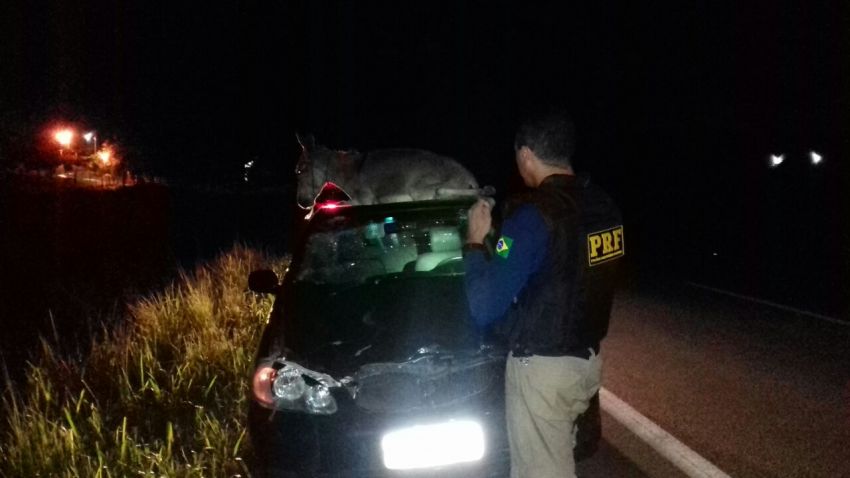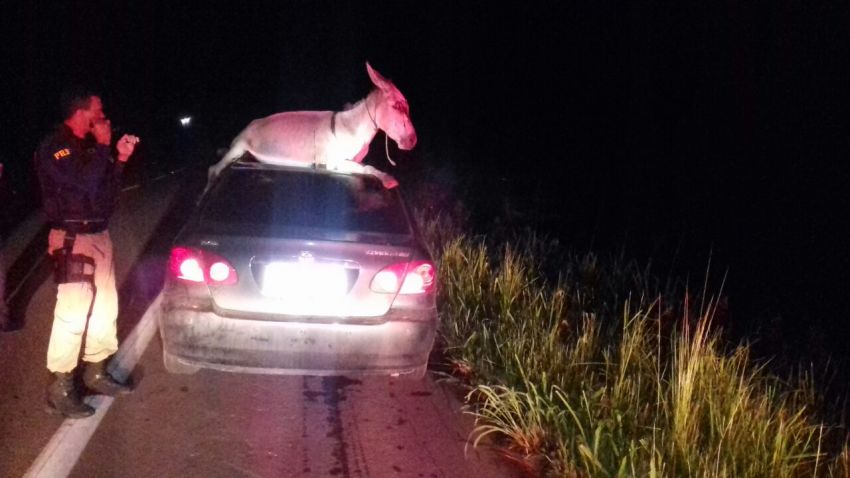 Agentes da Polícia Rodoviária Federal (PRF) atenderam um acidente no mínimo curioso no início da noite desta quinta feira, 16. O condutor de um veículo passeio modelo Corola trafegava normal no km 217, da BR 316, município de Governador Newton Belo, noroeste do estado do Maranhão, quando se deparou com um animal na pista. Sem tempo para se desviar do jegue o veículo acabou atropelando o animal, que por conta do impacto foi parar sobre o Corola, que ficou com avarias na parte da frente e no teto. Lesionado, o animal permaneceu em cima do automóvel até ser tirado.