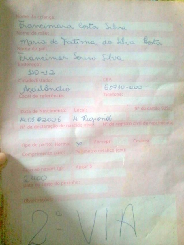 A família que cuida de Francimara Costa Silva, que a guarda da menina, mas para isso, preciso encontrar algum parente para legalizar a situação, caso contrario, o conselho tutelar, vai retira-la (Francimara Costa Silva) da família.