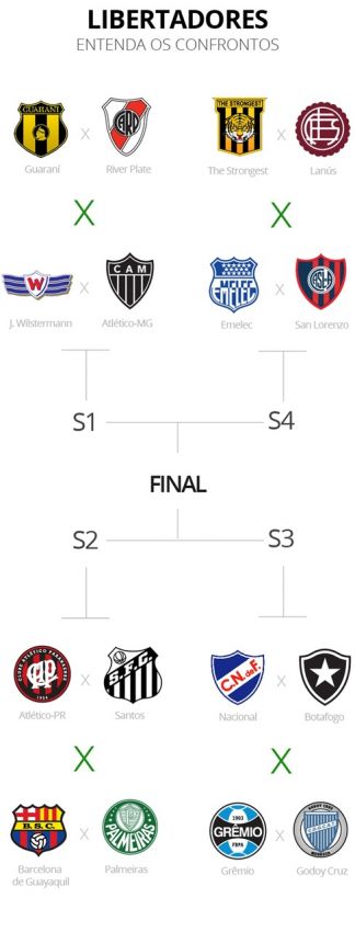 Nas quartas de final, Tricolor gaúcho e Glorioso podem se enfrentar. Outro duelo brasileiro pode ocorrer na próxima fase. Quem avançar do confronto entre Furacão e Peixe vai pegar o vencedor de Palmeiras x Barcelona de Guayaquil. No caminho do Galo estão Guaraní-PAR ou River Plate e só enfrentará um compatriota em uma possível decisão.