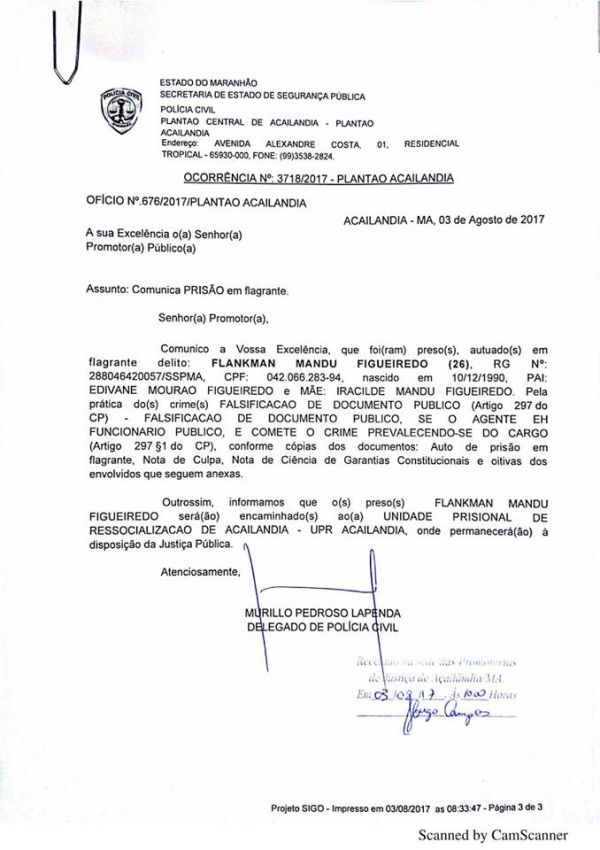 A Polícia Civil de Açailândia, por meio dos Investigadores; Ulisses, René e Frazão, prenderam em flagrante delito um professor contratado da rede estadual de uma escola do município identificado como Frankman Mandu Figueredo, de 26 anos. O mesmo é acusado de cometer o crime de falsificação de documento público (artigo 297 do Código Penal) na forma qualificada, segundo informações o acusado utilizou-se do cargo que ocupava para praticar o crime. O homem é morador do Bairro Capeloza, no município de Açailândia.