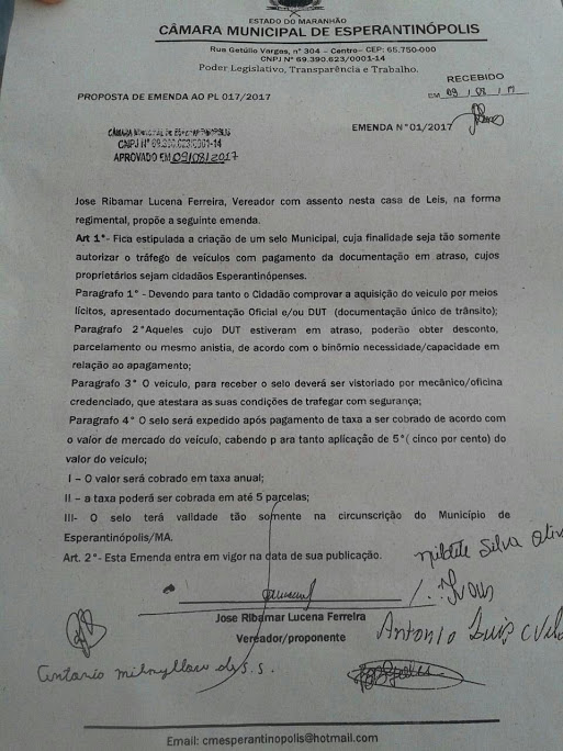Vereadores da base aliada ao prefeito Aluisinho do Posto (PCdoB), de Esperantinópolis, no interior do Maranhão, aprovaram na semana passada um curioso projeto de lei.