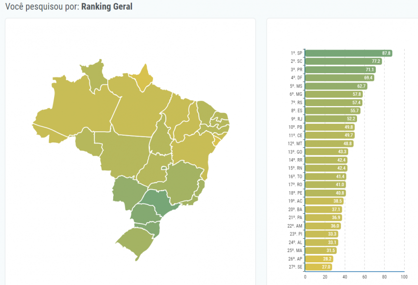 Em 2015 o estado figurava na 20ª colocação (com nota 43,1), depois passou a 23º em 2016 (com 34,3) e, em 2017, caiu para 25º (com 31,5). A nota geral vai de 0 a 100.