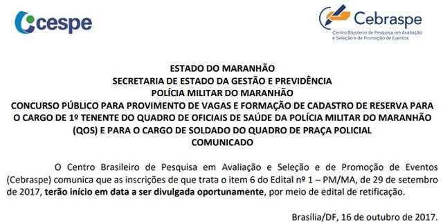 As inscrições para o concurso da Polícia Militar do Maranhão (PM/MA) foram adiadas, conforme informou nesta segunda-feira (16) o Centro Brasileiro de Pesquisa em Avaliação e Seleção e de Promoção de Eventos (Cebraspe), empresa responsável pela realização das provas.