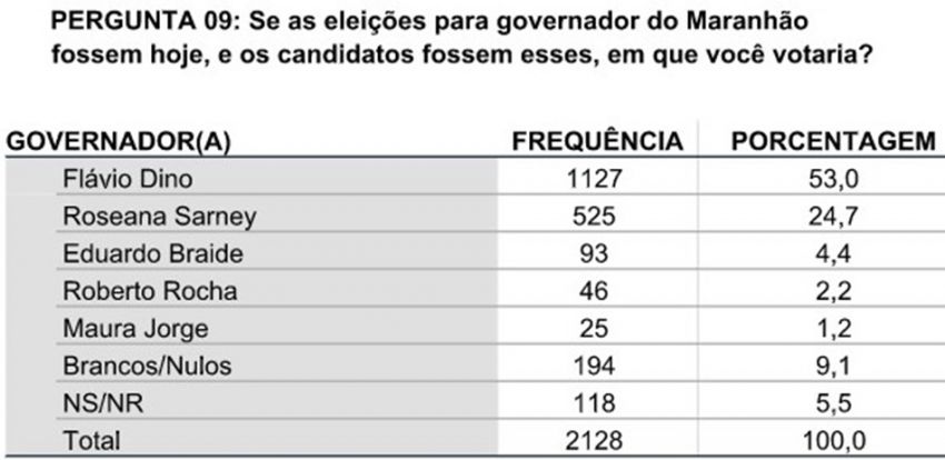 Se as eleições para o governo do Estado fossem hoje, Flávio Dino teria 53% dos votos, enquanto Roseana alcançaria 24,7%. Em seguida aparecem o deputado Eduardo Braide (4,4%), o senador Roberto Rocha (2,2%) e a ex-prefeita Maura Jorge (1,2%). Brancos e nulos somaram 9,1% e 5,5% não sabem ou não responderam.
