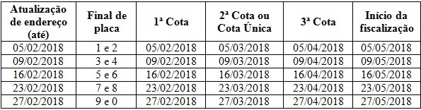 Já quem optar pelo parcelamento do IPVA 2018 fará o pagamento da primeira cota de acordo com o final da placa dos veículos. São três parcelas mensais, de fevereiro a abril.