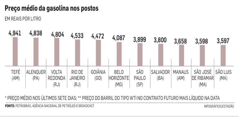 No Brasil, o preço médio do litro da gasolina é de R$ 4,194. A cidade onde o combustível custa mais caro é Tefé (AM): R$ 4,941.