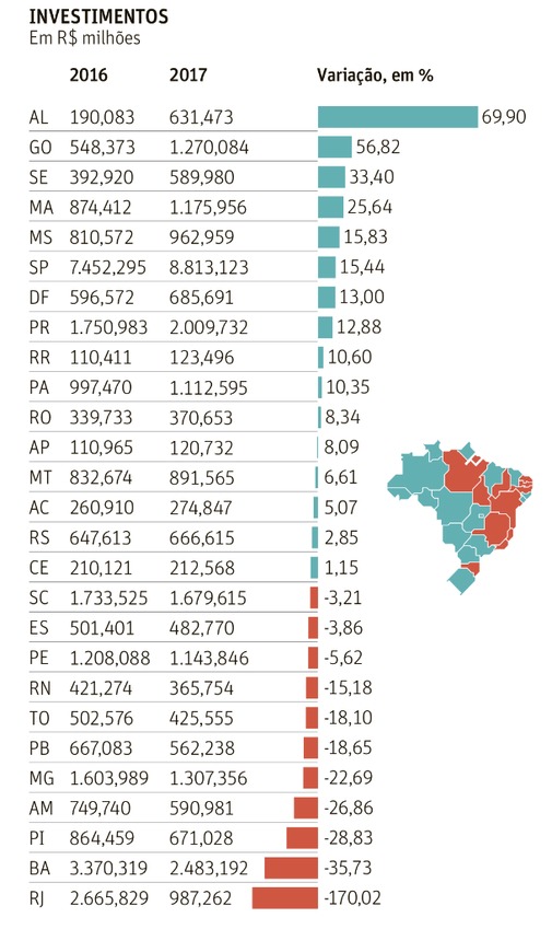 O Estado passou de R$ 874 milhões em 2016 para R$ 1.175 bilhão investido no ano seguinte, um crescimento de 26%.