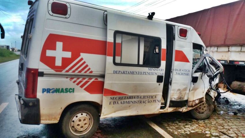 Por volta das 17h50 a pista estava molhada no km 5,7 da rodovia, quando, uma ambulância da Secretaria Estadual de Administração Penitenciária - SEAP, se deslocava no sentido crescente da rodovia. O condutor da ambulância trafegava pela faixa da esquerda e para não colidir na traseira de outros veículos que efetuavam manobra de retorno, desviou, freou, perdeu controle de direção e colidiu transversalmente em um conjugado trator e reboque que estava parado fora da pista, à direita..jpeg)