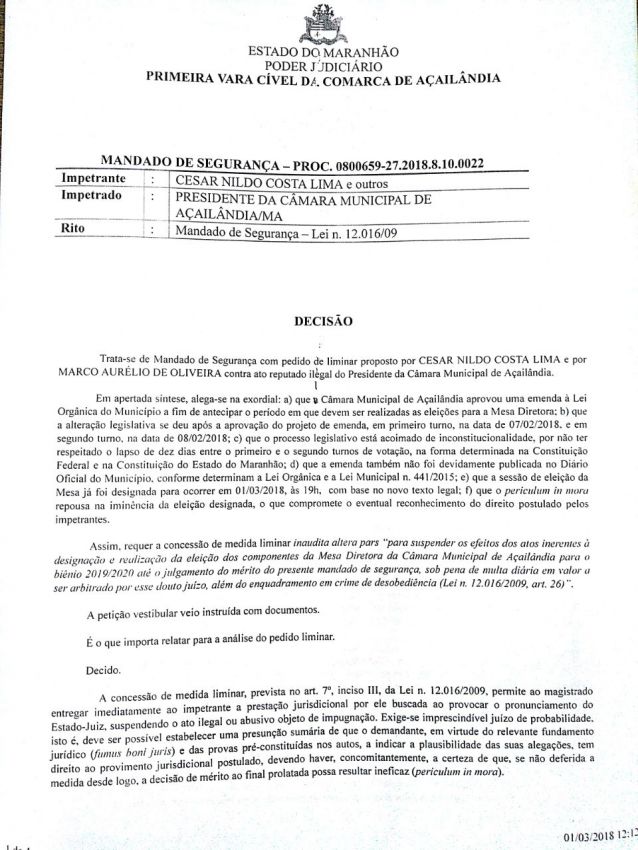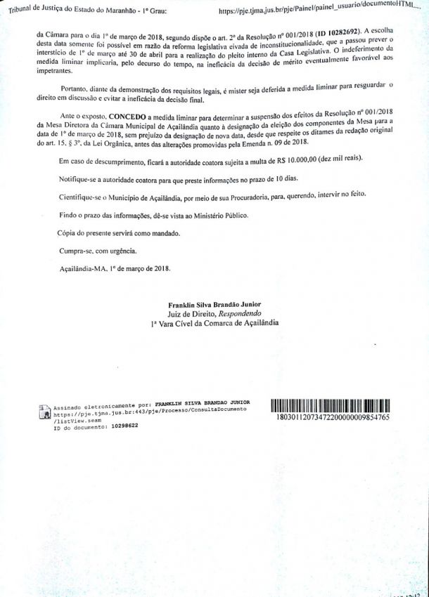 Açailândia: Sessão da Câmara Municipal desta quinta feira, onde deveria ser eleito o novo presidente da Câmara Municipal foi cancelada pela a Justiça.