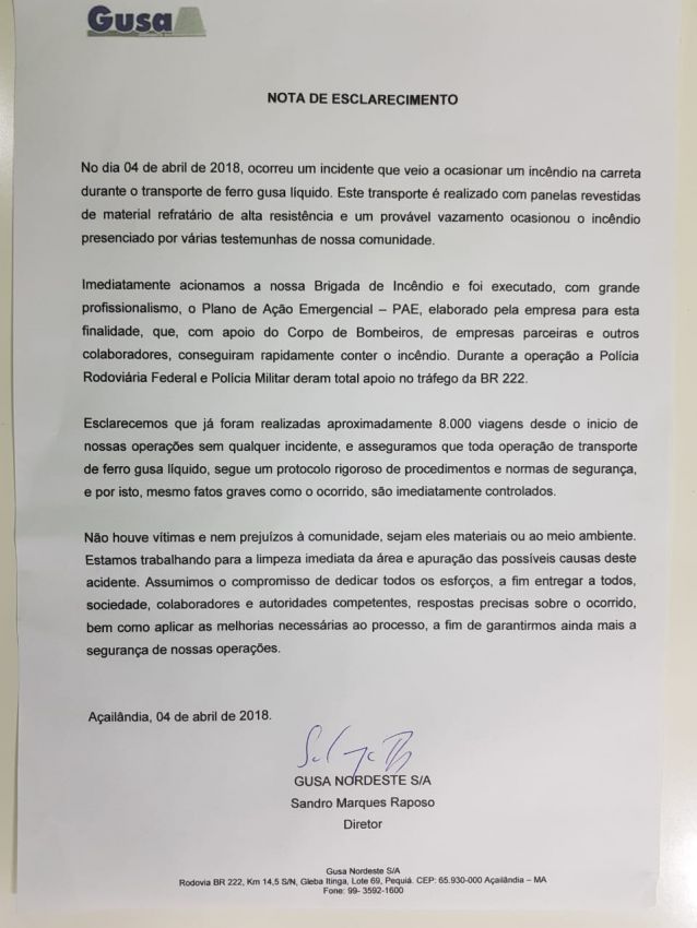 Esclarecemos que já foram realizadas aproximadamente 8.000 viagens desde o início de nossas operações sem qualquer incidente, e asseguramos que toda operação de transporte de ferro gusa líquido, segue um protocolo rigoroso de procedimentos e normas de segurança e por isso, mesmo fatos graves como o ocorrido, são imediatamente controlados.