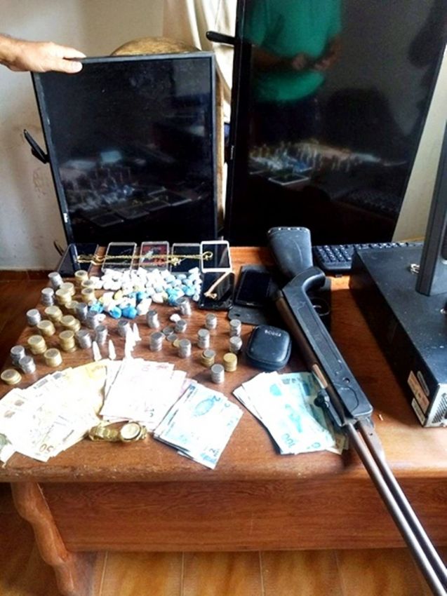 Diante dos fatos, os policiais foram até a casa de Leandro, localizada na Rua das Rosas com Rua das Orquídeas, no Bairro São Sebastião, onde foram encontrados: R$1.785,00 (em cédulas); 01 cofre de madeira contendo R$ 292,85 (em moeda); 02 cordões; 01 (uma) pulseira; 01 relógio da marca technos; 02 televisores (um da marca philco de cor preta de 32 polegadas e um da marca panasonic de cor preta de 42 polegadas, mais uma espingarda de pressão.