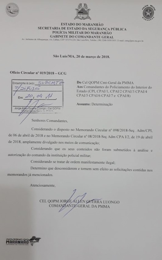 O Comando Geral da Polícia Militar do Maranhão expediu ofício nessa sexta-feira (20) para que fique claro que são ilegais e sem valor os documentos emitidos tratando de suposta determinação a Unidades do Interior sobre identificação de lideranças políticas. Essas notas foram emitidas sem o conhecimento e a autorização do comando da Polícia Militar.